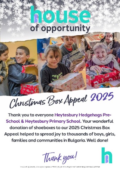 Thank you to the pupils, families and staff of Heytesbury Hedgehogs Pre-School & Heytesbury Primary School for your wonderful donation of shoeboxes to our 2025 Christmas Box Appeal! Altogether a total of 6,524 boxes were donated to the appeal, and our school played a part in spreading a lot of joy wherever the presents were distributed.